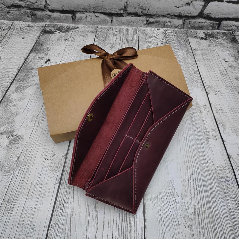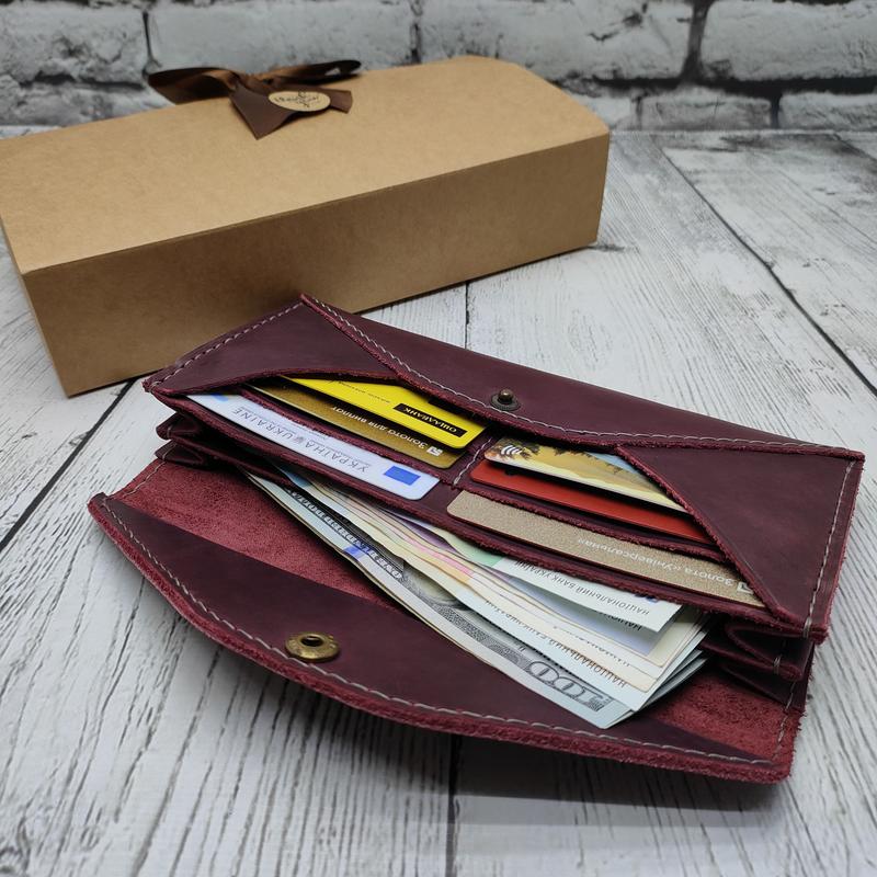 Кошелек выполнен из кожи крейзи хорс бордового цвета - натурального материала,
