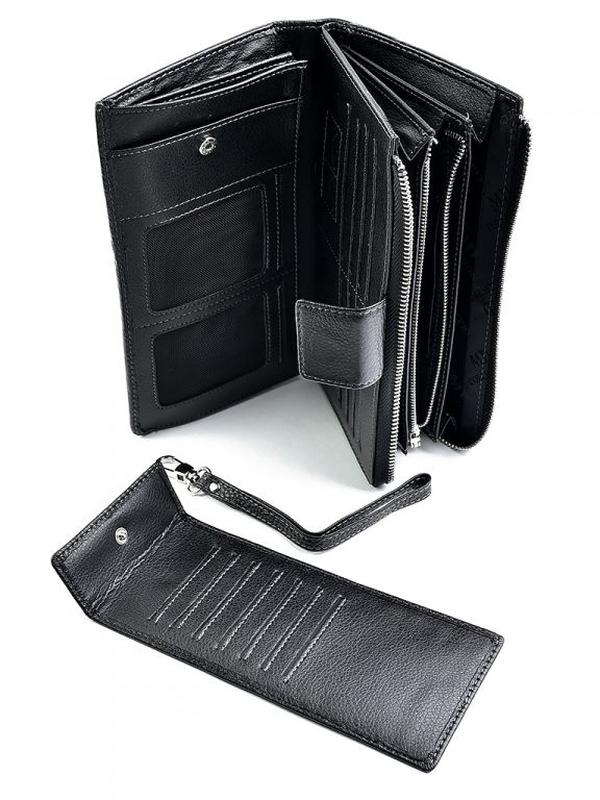 220*120*40. Чоловіча шкіряна барсетка. 2 сектора – 1 на магнитной кнопке, 1 на молнии. В секторе на магнитной кнопке: 2 отделения для купюр, 1 отделение на молнии, 2 прозрачных кармана под удостоверение, 8 карманов для карт, съемное отделение на кнопке в котором 6 карманов для карт. В секторе на молнии: 4 кармана для купюр, карман на молнии. С тыльной стороны - карман на молнии. В комплекте кистевой ремень. Борсетка поставляется в картонной коробке.