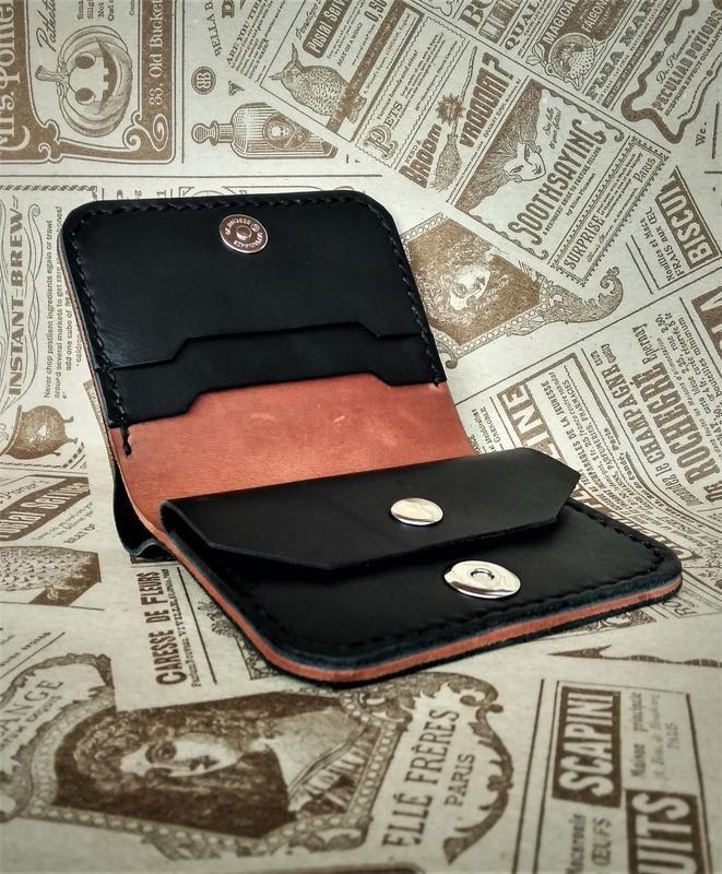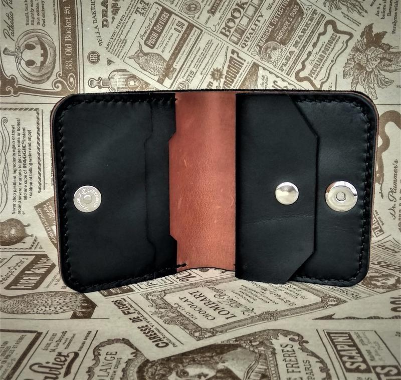 Небольшой кошелек с комбинацией кожи черного и коньячного цвета.