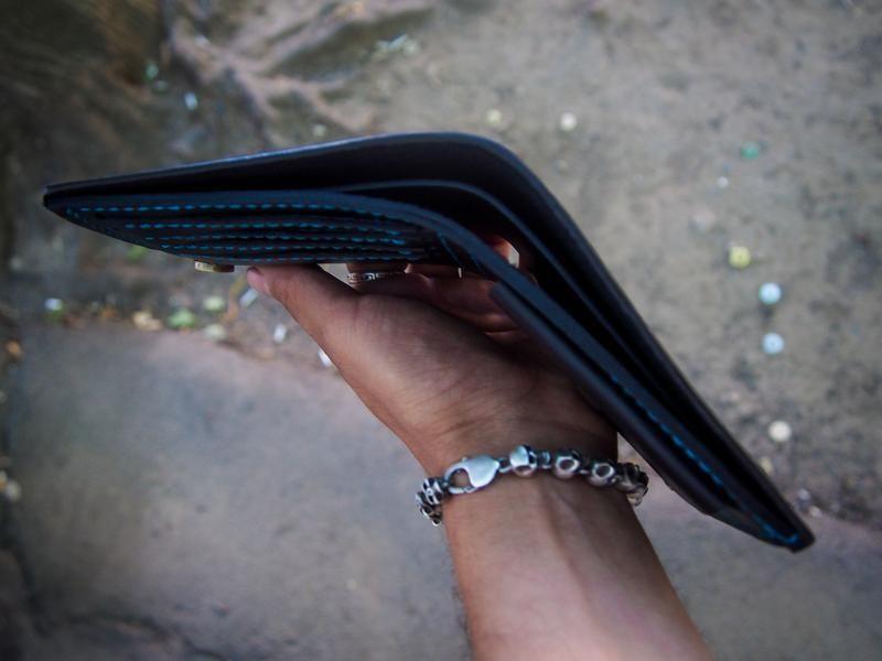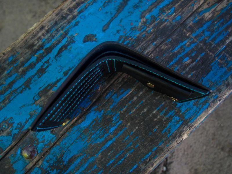 Кошелек выполнен из натуральной итальянской кожи растительного дубления, толщина кожи 2 мм. Покраска кошелька происходит в несколько этапов, вначале это пропитка разнообразными средствами, насыщение маслом изделия для мягкости и эластичности кожи. Далее происходит нанесение цвета – гель-антиком с эффектом патинирования. После покраски кошелек покрывается лаком, для защиты краски от истирания, также лак защищает кошелек от влаги. Прошивка по периметру выполняется только вручную, вощеной нитью седельным швом. Только ручной шов делает изделие максимально прочным и износостойким. Торцы изделия мы полируем, обрабатываем и прокрашиваем, что придает изделию завершенный вид.