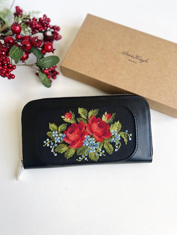 Шкіряний гаманець з вишивкою ручної роботи стане для Вас незамінним аксесуаром або незабутнім подарунком для близьких. ✔️Натуральна шкіра ✔️Ручна вишивка хрестиком ✔️В середині натуральна шкіра ✔️Функціональність: 8 відділень на картки 4 відділення для купюр кишеня на блискавці для монет ✔️Пакування : подарункова коробка ✔️Розмір: 20-10 см