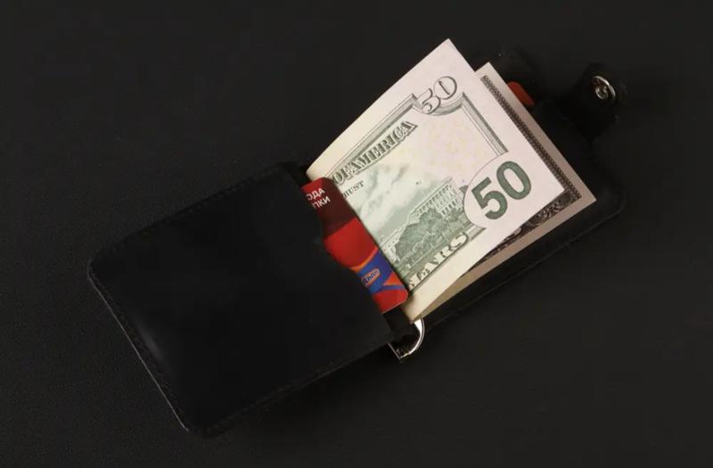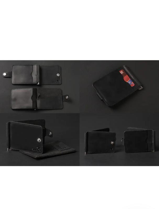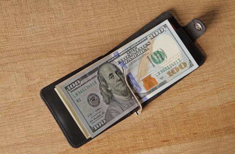 Современный мужской зажим для денег. Аксессуар изготовлен из натуральной высококачественной кожи. Цвет фурнитуры: серебро. Изделие аккуратно прошито сверхпрочной черной нитью. Закрывается аксессуар с помощью кожаного хлястика на кнопке. На задней внешней стороне расположен карманчик для пластиковых карточек.