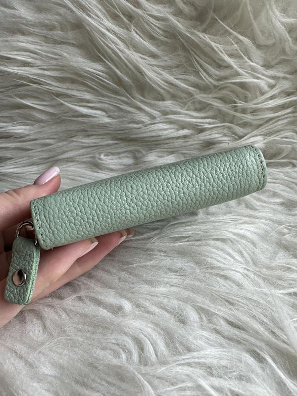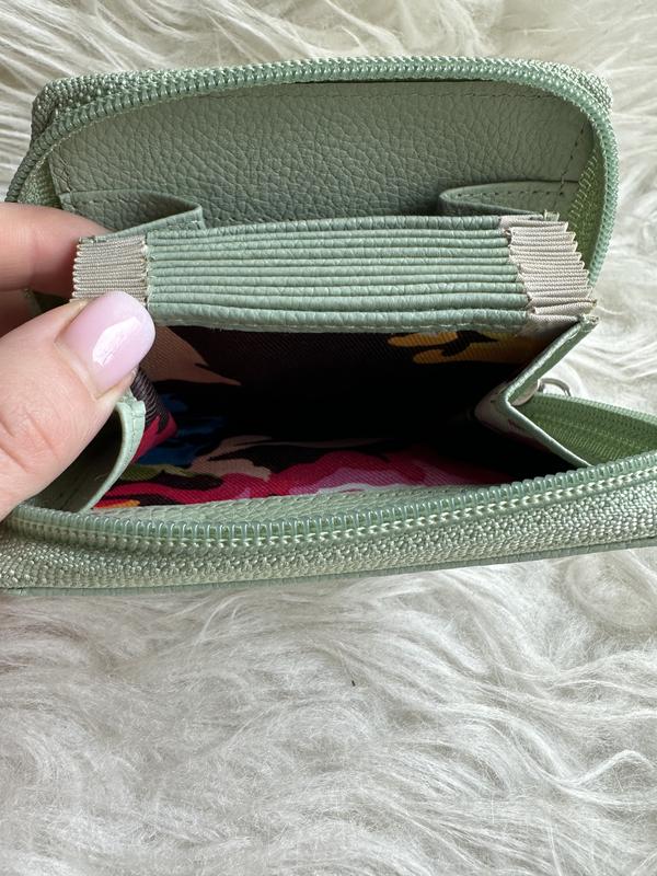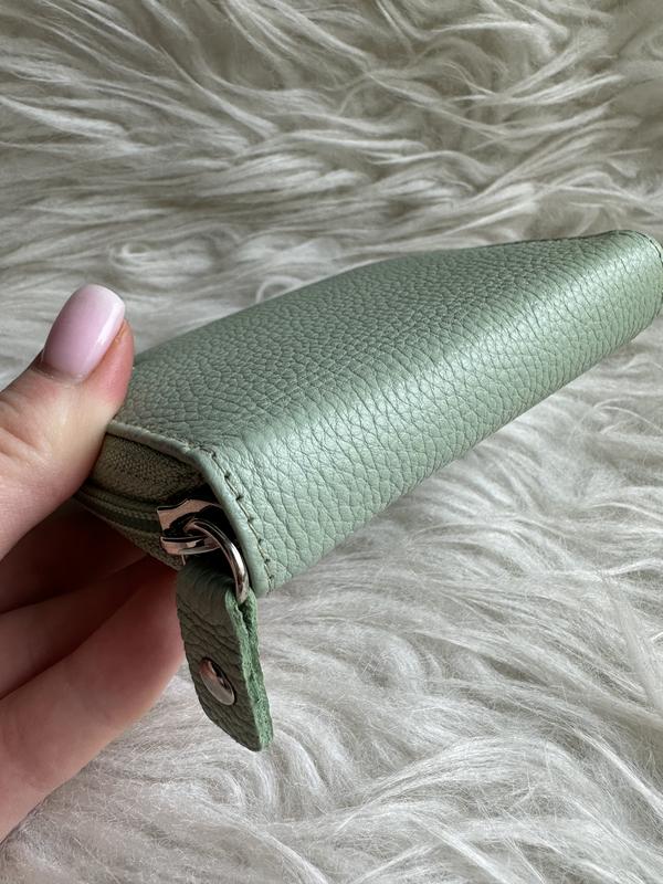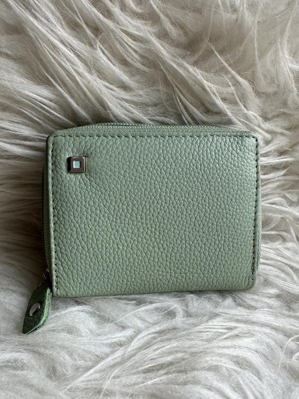 Шкіряний жіночий картхолдер 8х10см на застібкі.Колір приємний - мʼятний. Стан ідеальний, без дефектів та потертостей!