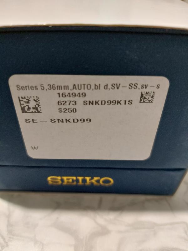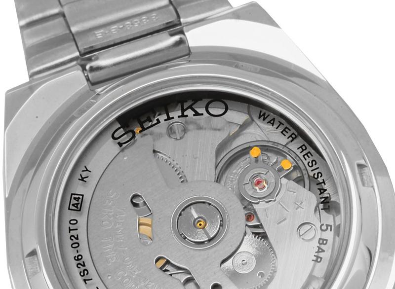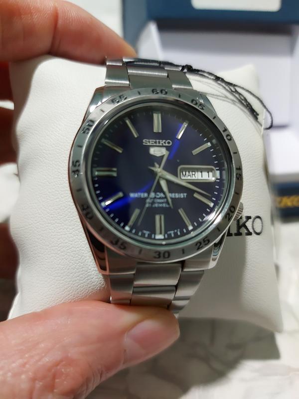Stainless steel case with a stainless steel bracelet. Fixed stainless steel bezel. Blue dial with luminous silver-tone hands and index hour markers. Minute markers around the outer rim. Dial Type: Analog. Luminescent hands and markers. Day of the week and date display at the 3 o'clock position. Seiko caliber 7S26 automatic movement, based upon Seiko 7002, containing 21 Jewels, bitting at 21600 vph, and has a power reserve of approximately 40 hours. Scratch resistant Hardlex crystal. Pull / push crown. Transparent case back. Round case shape. Case size: 36 mm. Case thickness: 12 mm. Band width: 20 mm. Fold over clasp with a push button release. Water resistant at 50 meters / 165 feet. Functions: date, day, hour, minute, second. Additional Info: suitable for snorkeling, as well as swimming, but not diving. Series 5 Series. Casual watch style. Watch label: Japan Movt. Seiko Series 5 Automatic Blue Dial Men's Watch SNKD99K1S.