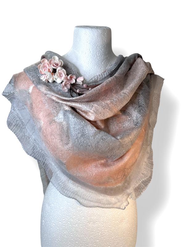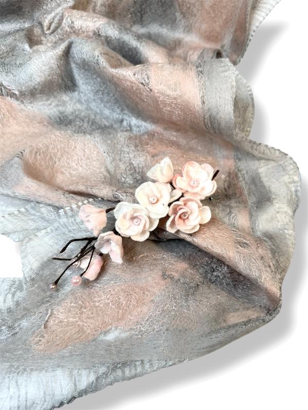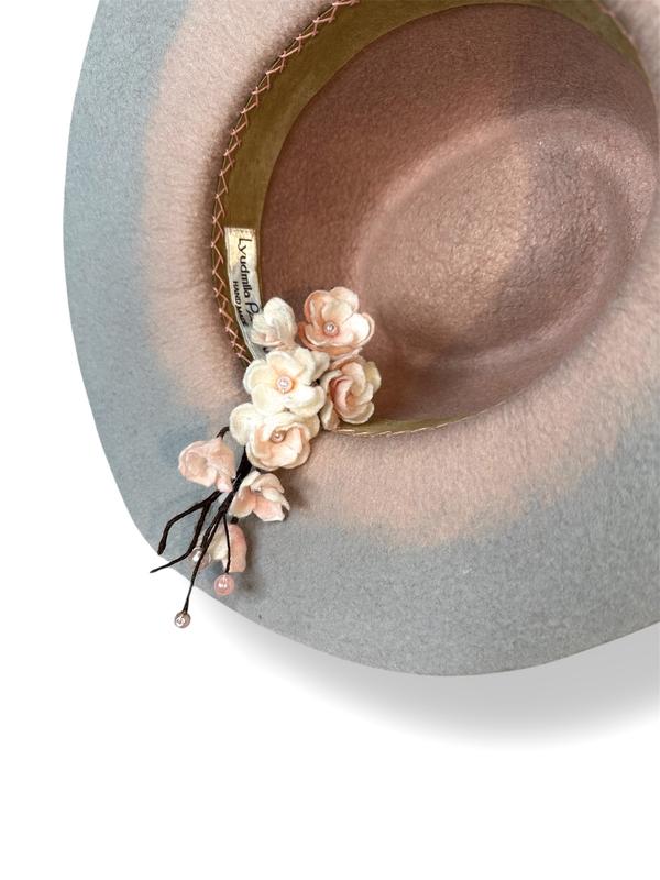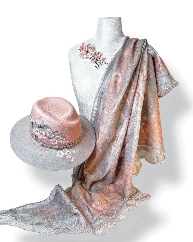 🌸Этот изысканный комплект под названием "Сакура" создает ощущение нежности и весеннего пробуждения. Валяная шляпа из шерсти пастельно розово-серого оттенка украшена хрупкими веточками сакуры, которые словно только что расцветали. Изящная отделка в виде декоративной плетеной тесьмы добавляет элегантности и выдерживаемости.