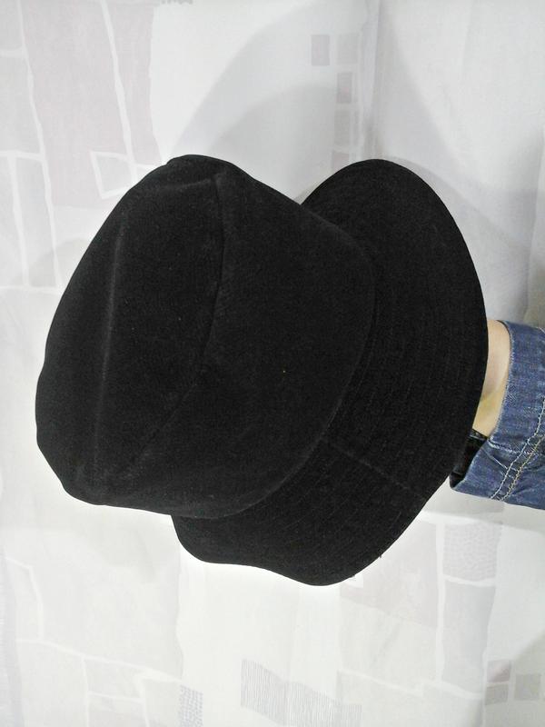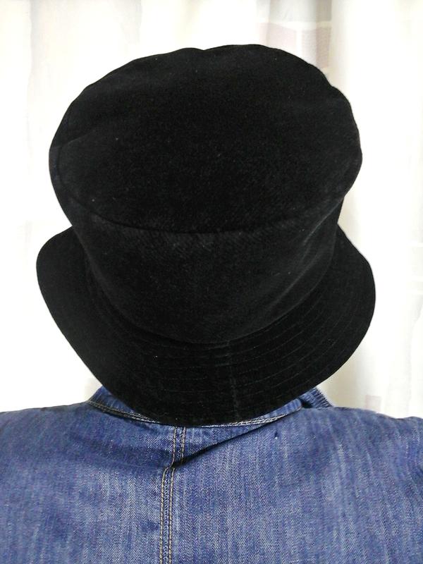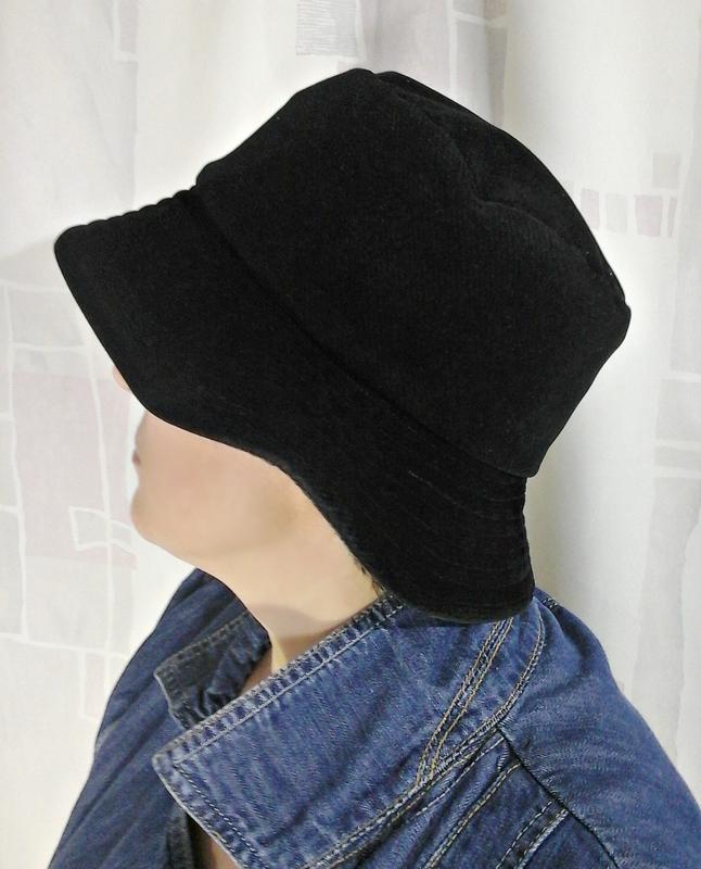 Интересная шляпка модного фасона типа "клош" из мелкого черного вельвета. Поля простеганы, внутренняя часть из серого твида "елочка".