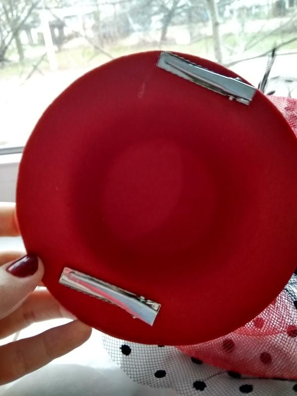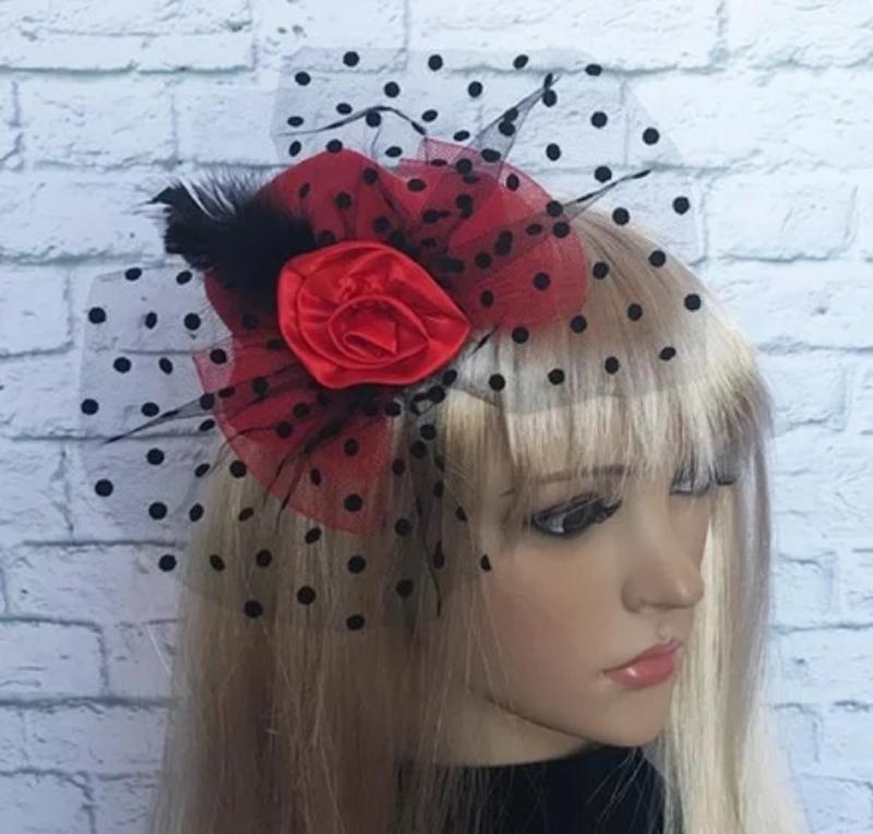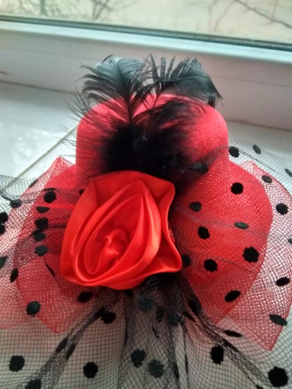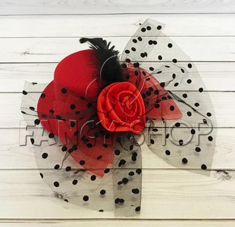 Капелюшок "Гламур" з трояндою і пером. М'який, оксамитовий капелюшок прикрашений пухнастим пір'ям і шовковистою трояндою з великим бантом з фатину. Капелюшок кріпиться до волосся за допомогою двох шпильок. Мініатюрний капелюшок - один з улюблених аксесуарів леді з королівських сімей. Будьте в тренді - доповніть свій образ гарним аксесуаром! Розмір: діаметр з полями: 13см, ширина полів: 3 см, висота: 5 см; Колір: червоний, чорний. Кріпиться за закололочки.