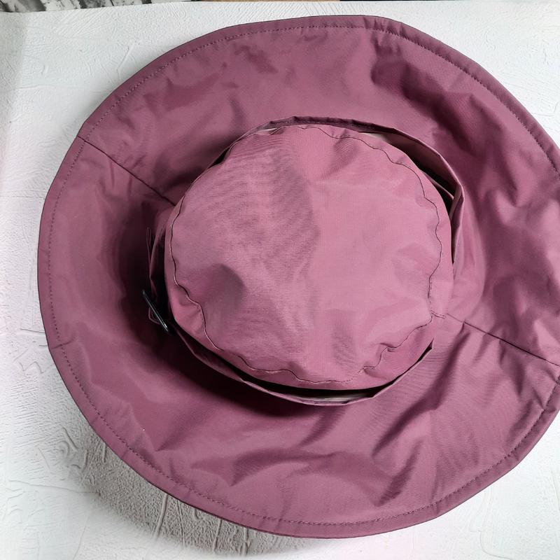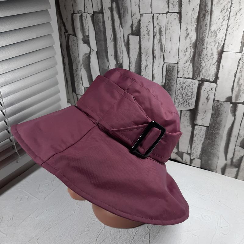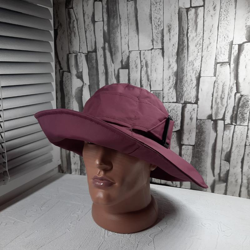 Шикарный, стильный шляпка от дождя и ветра.Ткань полиэстер - плащевка. Подкладка-хлопок. Цвет темно розовый, вино Объем головы 57см,По свтой форме отлично подходит и для 55см-56 см. Глубина 33см Поля 10см Без дефектов.Стан нового.