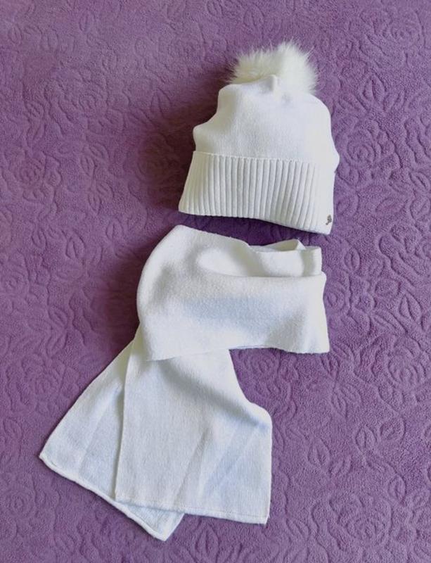 Набор шапка шарф белый. Шапка на подкладке. Стан - идеальный. Помпон натуральный енот Размер на 12-15 лет.