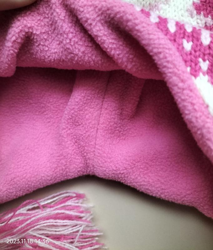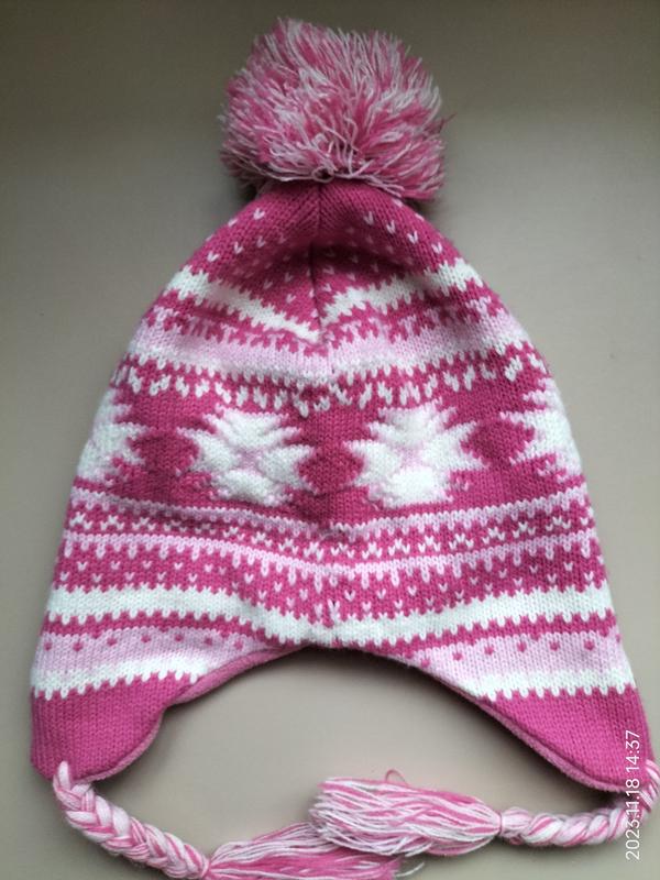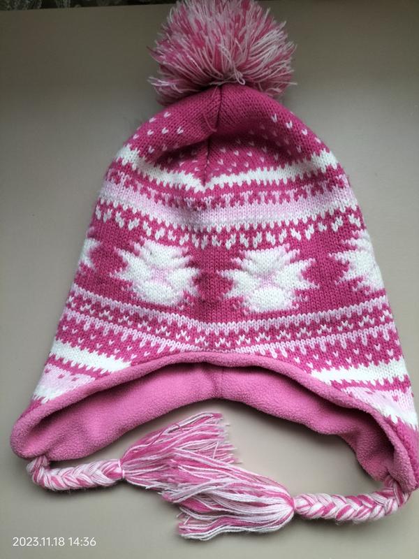 Шапочка теплая в идеальном состоянии, хорошо закрывает ушки, шею. Приятный жаккардовый принт. Замеры: высота шапки спереди 20 см, со стороны затылка -24 см, сбоку с ушками до завязок 30 см, полуокружность 24 см, внутри теплый флис. На возраст 1,5-2,5 года в зависимости от окружности головы ребеночка.