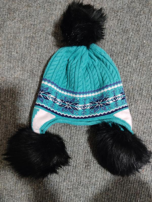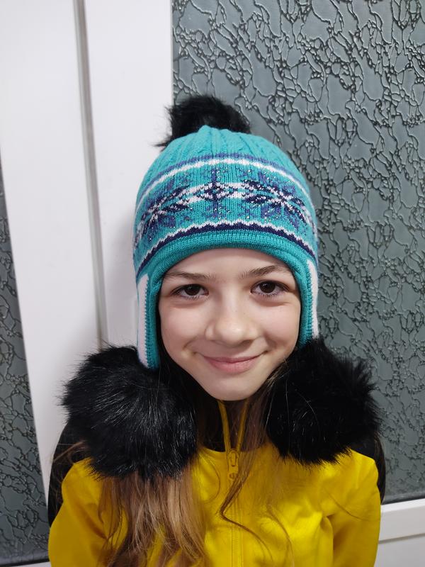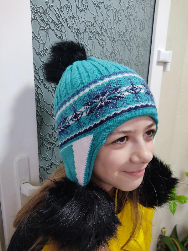 Шапка вязанаДвойна вязкаКрасиво тянется. На фото ребенок 11 лет3 бамбониЦвет - бирюзовыйУкрашено камушками