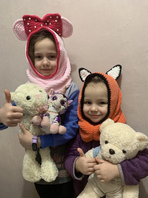 Хомут шапка шарфРозовый с бантиком: ширина 30см; длина 45смОранжевый с ушками: ширина 28см; длина 40см