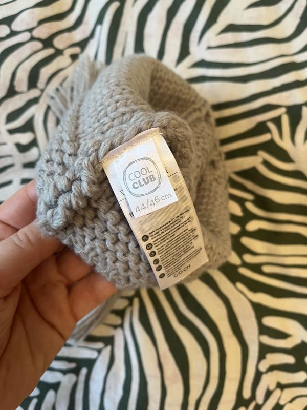 Трендовый вязаный каточепчик серого цвета пушистая шапка с ушками