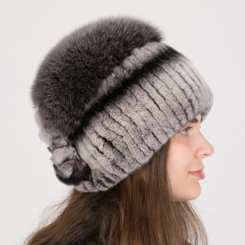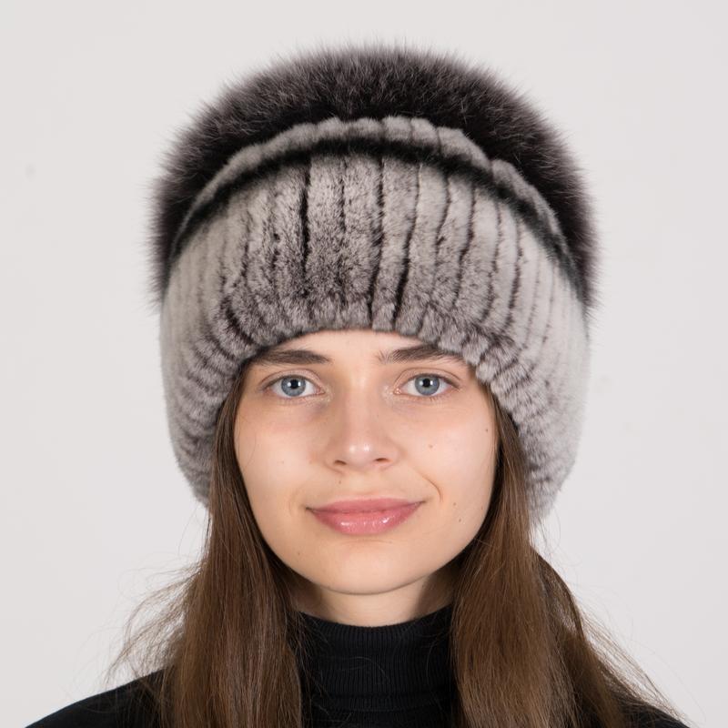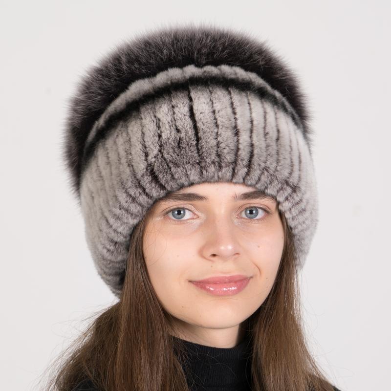 Женская зимняя меховая вязаная шапка из натурального меха кролика с помпоном из меха песца — идеальный аксессуар для стильных женщин, которые ценят комфорт и элегантность в холодное время года.