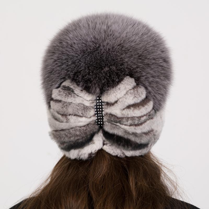 Декор: Уникальная аппликация в виде стрекозы из меха кролика, украшенная стразами и камнями, придает шапке изысканный и оригинальный вид, делая её стильным акцентом в зимнем образе.
