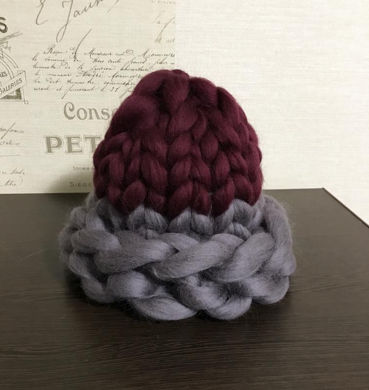 Модная двухцветная шапочка из толстой пряжи. Есть в наличии много других цветов шапочек. Смотрите другие мои объявления или пишите - покажу их вам. Размер шапки 54-58 см