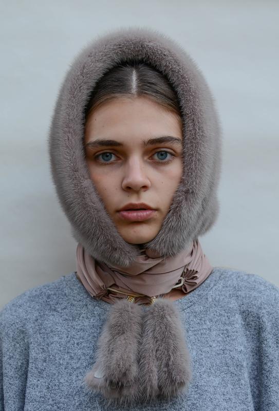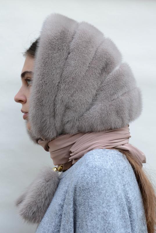Жіночий хутряний капюшон з хутра блюфросту та тканини ангори.
