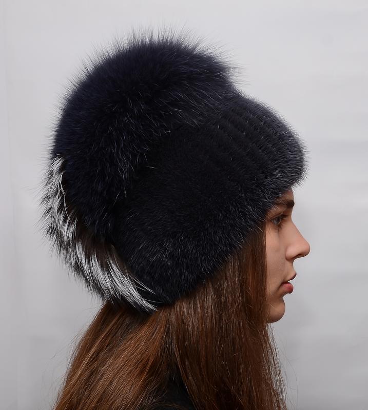 Женская зимняя норковая шапка с помпоном из песца и украшением сзади в виде аппликации с мехом чернобурки и стразами, цвет: Синий ирис, размер: Универсальный, в наличии доступно более 10 видов цвета норки, уточнять в лс.