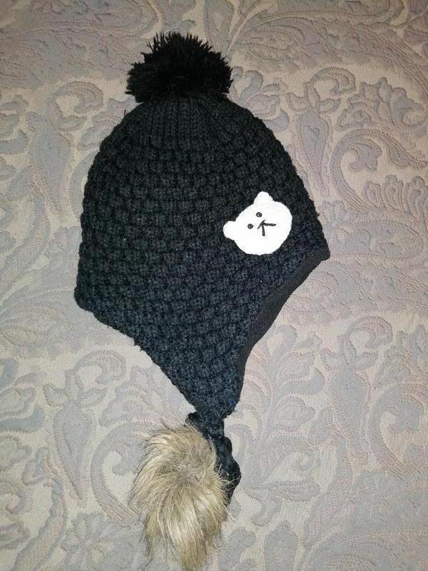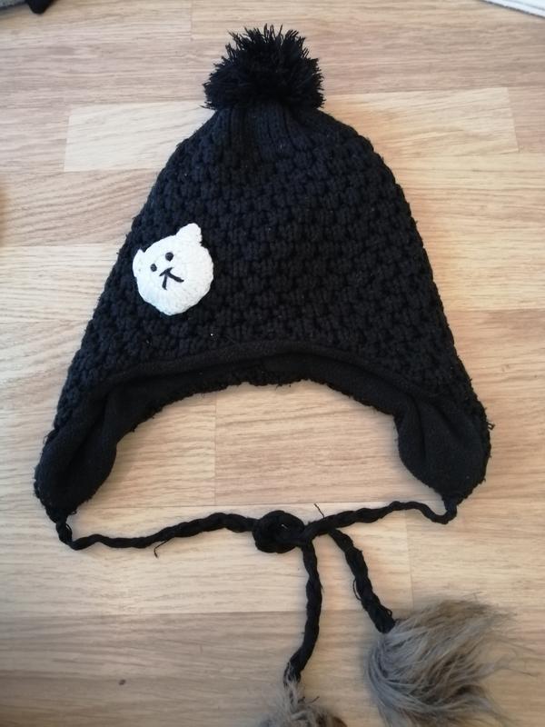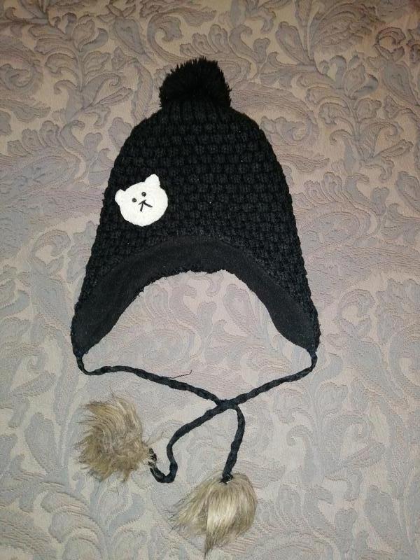 Шапка зимняя двойная вязанная для девочки с завязками. Верх- вязанная 100% акрил, Подкладка флис плотный - 100%полиэстер. Обхват - 50-53 см. Глубина 20 см. Длина завязок по 32 см. Аппликация вязанная белая в виде мишки.