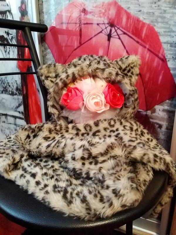 Шапка с ушками и шарфом с леопардовым принтом. На шарфе есть карманы для рук.
