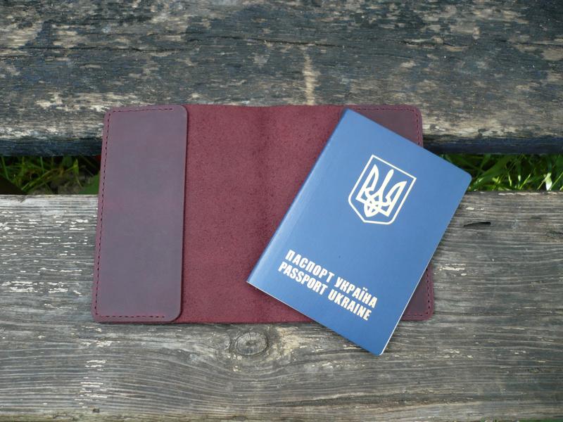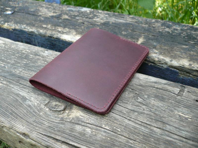 Обкладинка для паспорта. Шкіри ВРХ ′crazy horse′, колір пурпурний-слива. Розмір 100*135 мм. Фінішне покриття – крем IEXI wrens dubbin. Уріз оброблений засобом tokonole (Японія). Прошита вощеною ниткою galaces 0,45 mm. Ручна робота. Цінність: 258 грн.