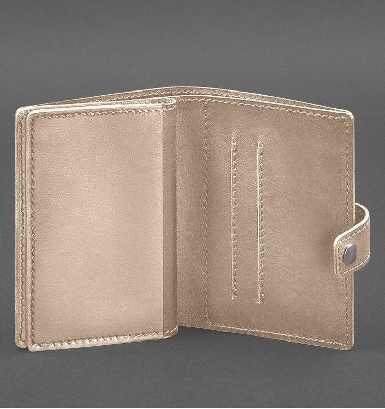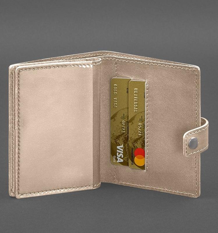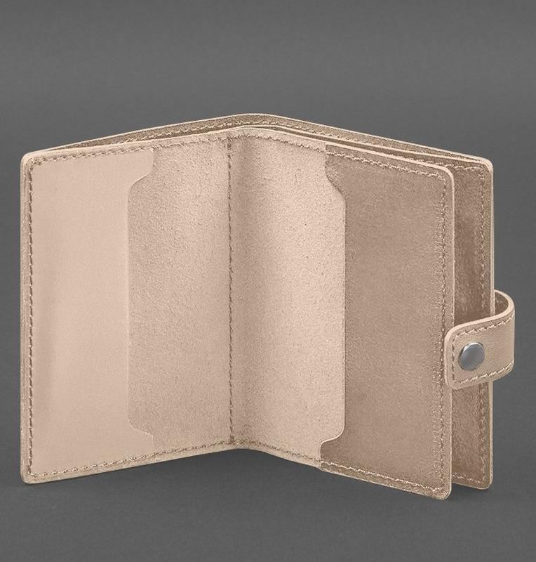 Внутри одно отделение для купюр, отдельный разворот для документа, 2 слота для пластиковых карточек, одно отделение с прозрачным окошком.