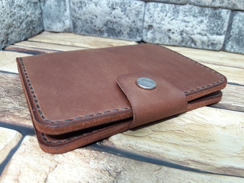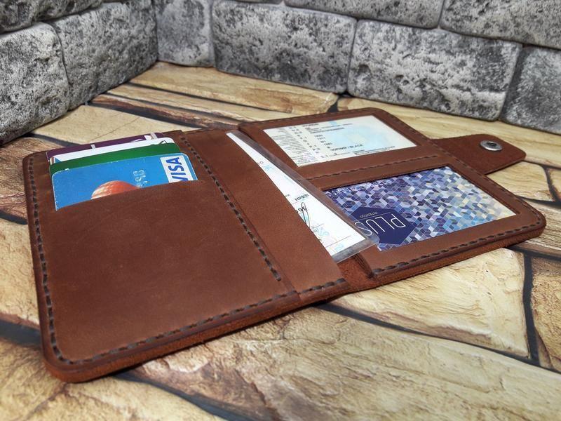 Обложка для документов из кожи. Кожа crazy horse коричневого цвета толщиной 1,4-1,6 мм. Холдер прошит 1 мм вощеной нитью вручную. Обложка имеет 2 больших отдела для денег или документов, 4 отдела для карт и 2 отдела в виде окошка для пластиковых документов. Закрывается на кнопку. Размер изделия 13 см*10,5 см