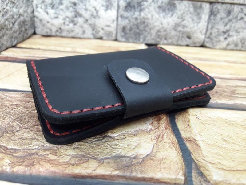 Обложка кожаная для id документов. Черная кожа crazy horse толщиной 1,4-1,6 мм прошита красной строчкой 1 мм вощеной нитью. Внутри обложки 2 отдела окошка для таких документов как паспорт, водительское удостоверение, техпаспорт на авто. Закрывается на кнопку, которая находится на хлястике. Холдер очень компактный и удобный. Размер в закрытом виде 9,5 см*7 см