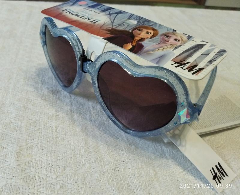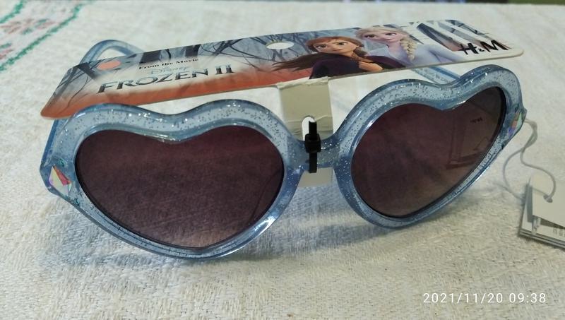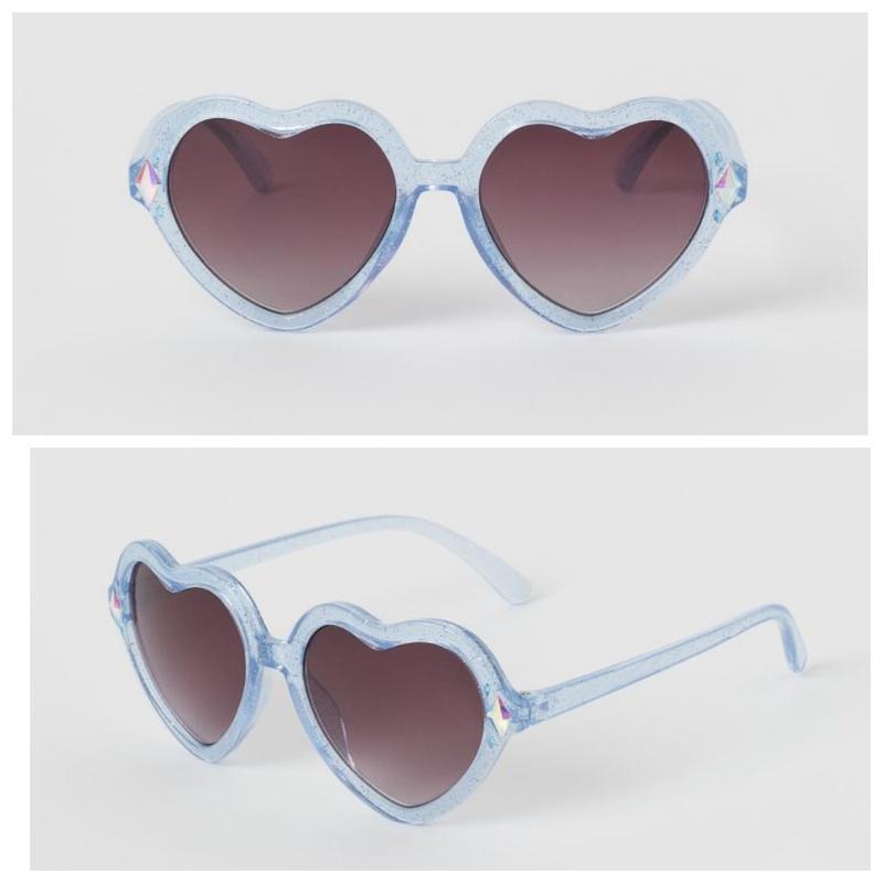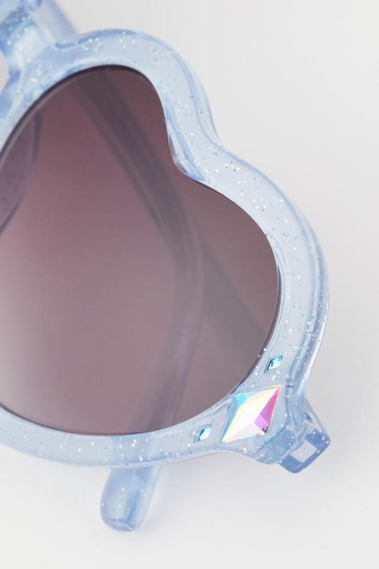 Солнцезащитные очки в форме сердца из блестящего прозрачного пластика с мерцающими гранеными украшениями в виде ледяных кристаллов на оправе. Очки имеют тонированные линзы с защитой от ультрафиолета.