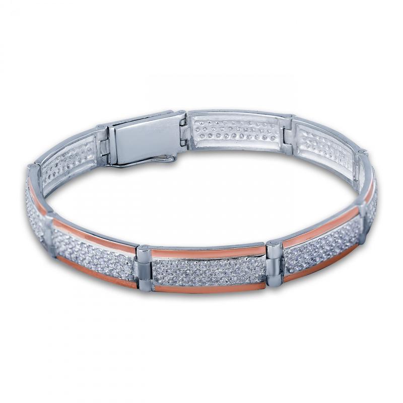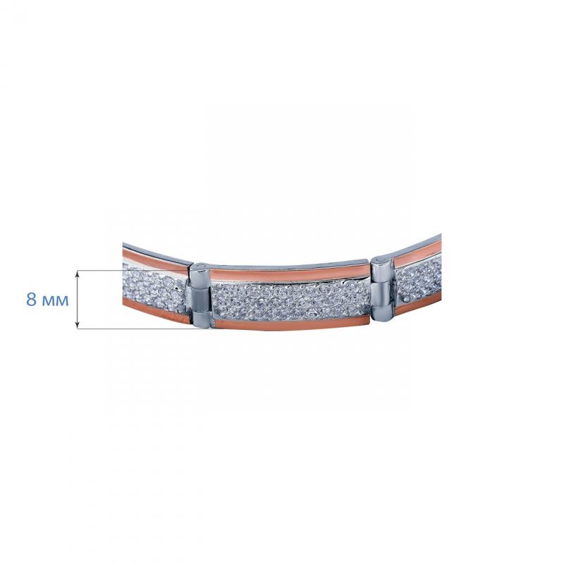 Срібний браслет із золотими вставками та розсипом білих фіанітів посередині -