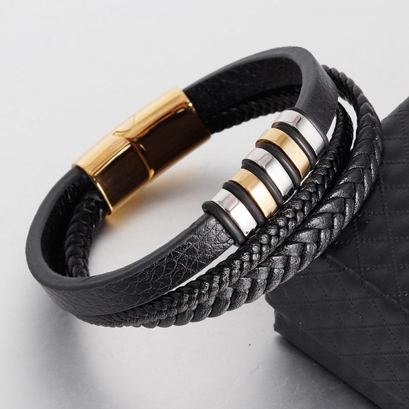 Аксессуар который достоин внимания. Безупречный, кожаный браслет с золотыми вставками послужит для вас незаменимым аксессуаром на каждый день. Отлично сочетается с часами или другими аксессуарами. Выполнен исключено из натуральной кожи и нержавеющего цинкового сплава. Надёжный магнитный замок.