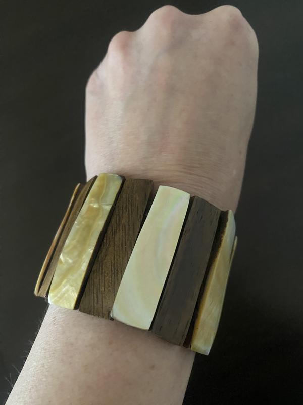 Эффектный браслет из натуральных материалов - дерево и перламутр. На резинках. Тянется на любое запястье. Ширина 9 см, высота 4,5 см