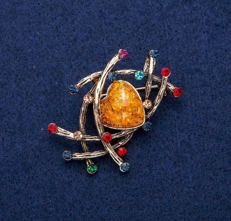 Брошь Кулон с Кабошоном Янтарь (им) и стразами 33х48мм, золотистый металл