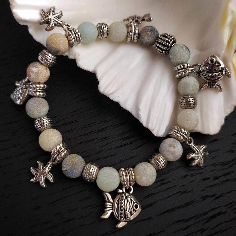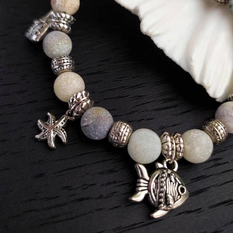 Перед Вами превосходный агатовый браслет на морскую тематику. Бусины агата матовые, шероховатые, приглушенных оттенков, как будто отшлифованы самим морем! Браслет собран на резинке, украшен подвесками в в виде рыбок и морских звёзд - отличное украшение в стиле бохо!