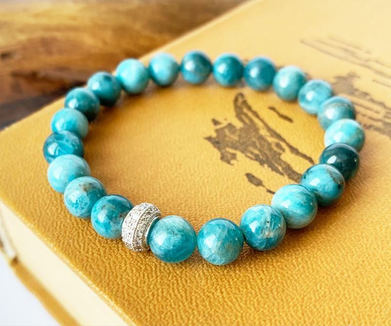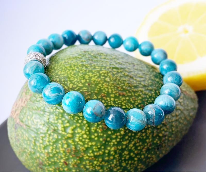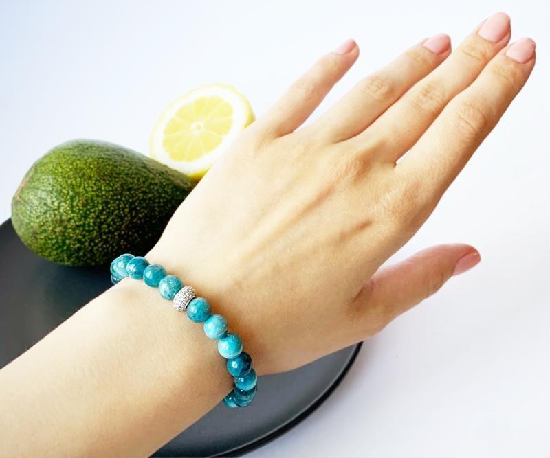Яркий браслет и бусин натурального апатита цвета морской волны.
