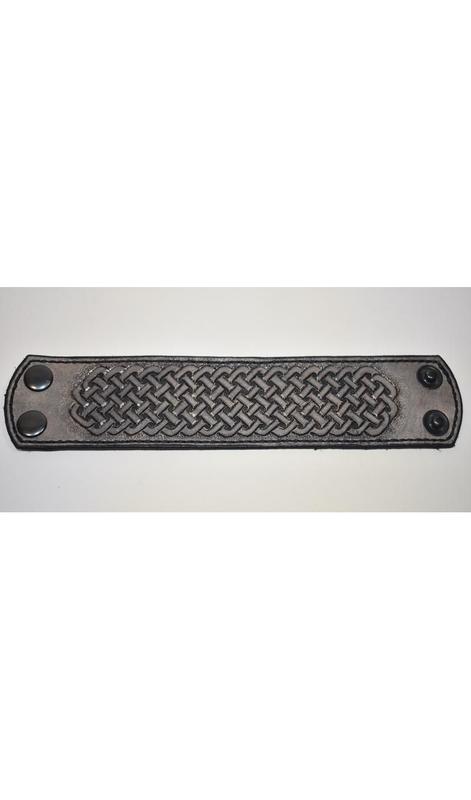 Браслет серый шириной 5см. Выполнен из натуральной кожи растительного дубления. На тиснении кельтский узор. Браслет выполнен с двумя металлическими застежками.