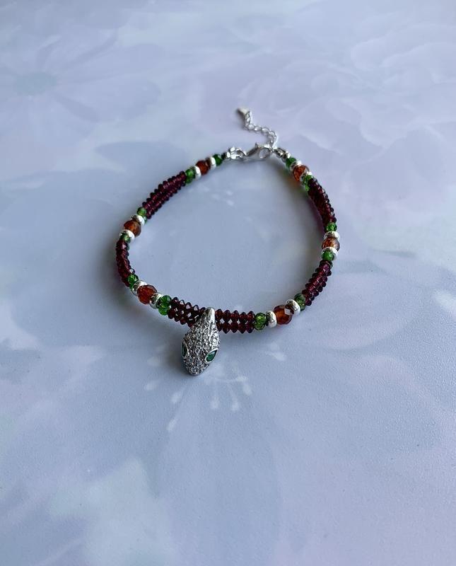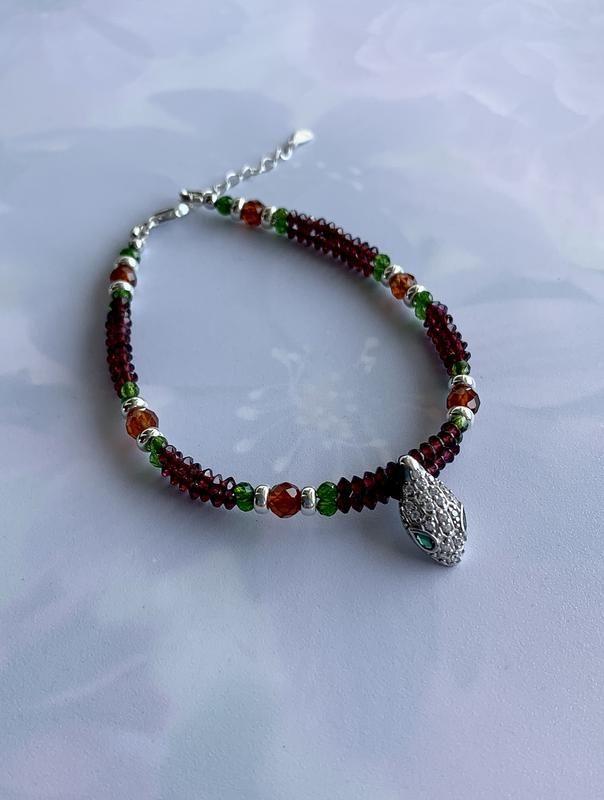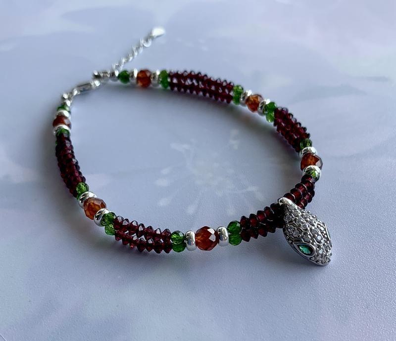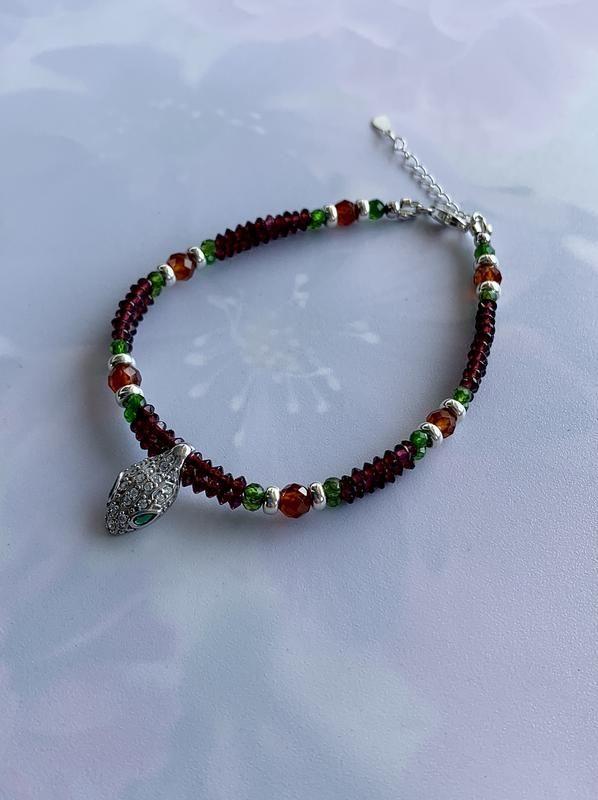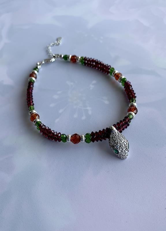 Оригинальный браслет из натуральных камней и серебра с подвесом "Браслет Клеопатры". Длина украшения 19,5 см. На руку 17,5 - 18,5 см плюс удлинительная цепочка 3 см. Натуральные камни разных цветов, разных размеров, разной органки: гранат пироп, гранат спессартин (редкий) 3 и 5 мм., диосид (ещё его называют "сибирский изумруд") 3 и 4 мм. Интересный серебряный подвес в виде "головы змеи" с хрустальными и зелеными цирконами. Фурнитура серебряная s925.