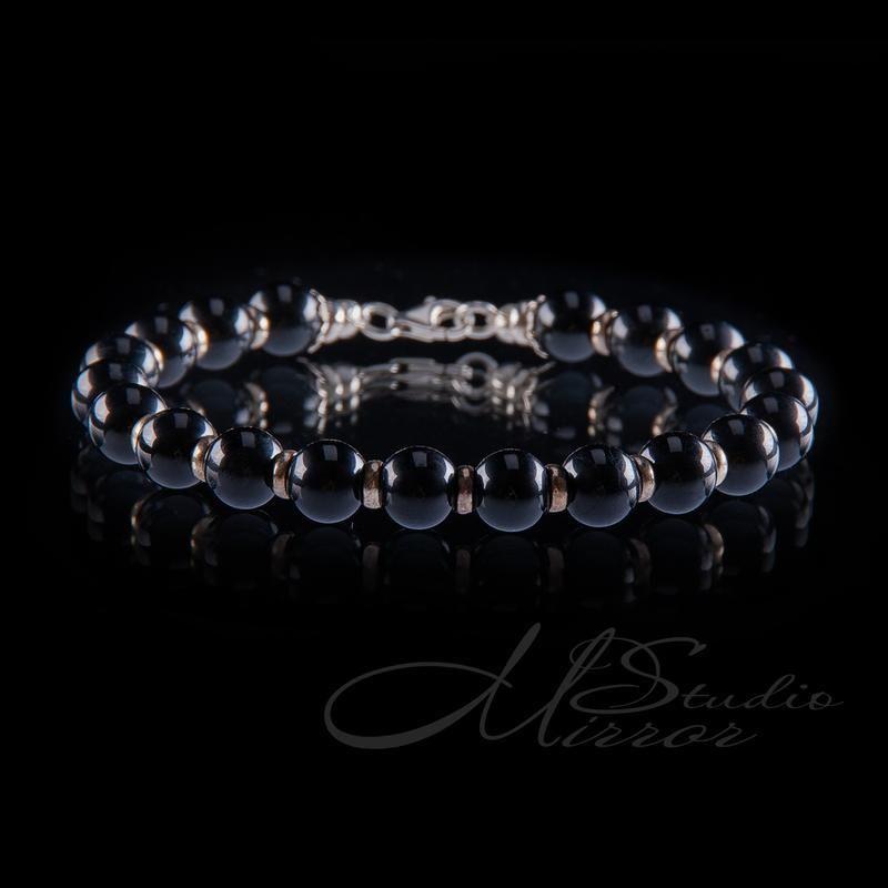 Браслет из черного турмалина (шерл) (шар 8 мм) с серебряной фурнитурой,на ювелирном троссе.
