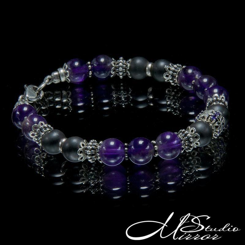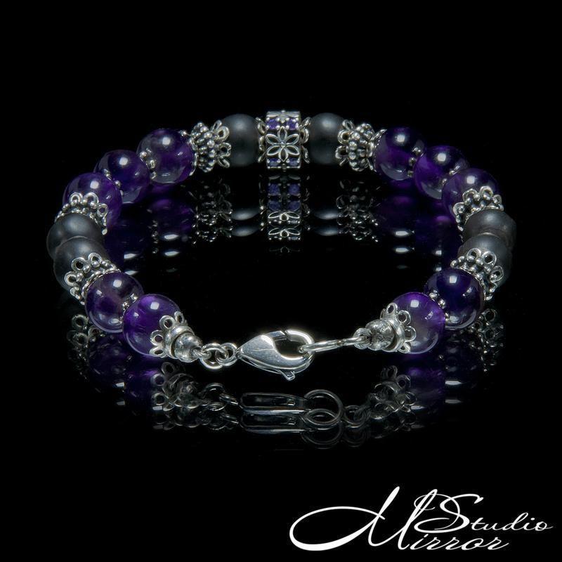 Браслет из бусин аметиста ( шар 8 мм ) и черного нефрита ( шар 8 мм ) с серебряной бусиной инкрустированной цирконами на ювелирном тросе.