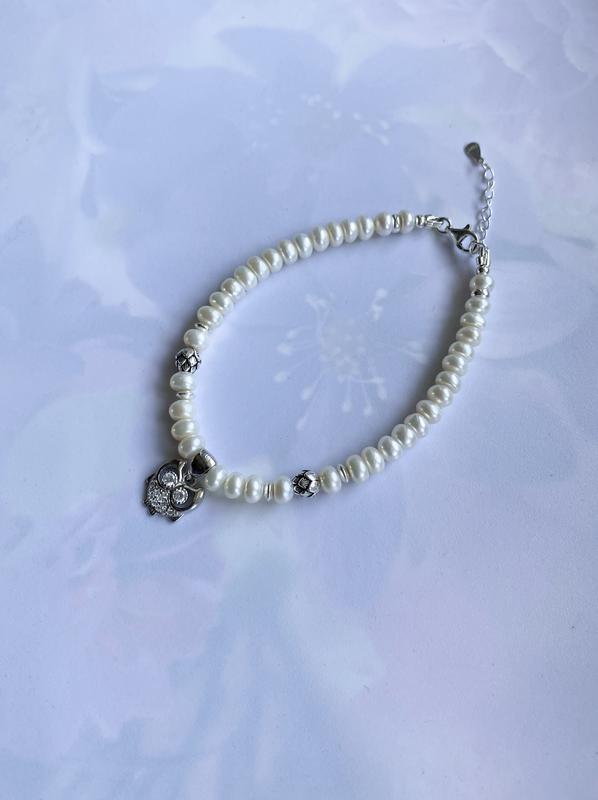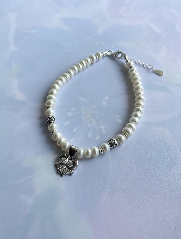 Шикарный браслет из натурального белоснежного жемчуга с серебром и подвесом «Жемчужная сова». Длина украшения 20 см. плюс удлинительная цепочка 3 см. На руку 17,5 - 19 см. Белый жемчуг высокого качества (форма «кукуруза») 6 мм. Оригинальный серебряный подвес «сова» с фианитами (родиевое покрытие, не темнеет, стоит проба серебра), размер 17*11 мм., 2 серебряные шишечки дополняют композицию. В изделии использована серебряная фурнитура s925.