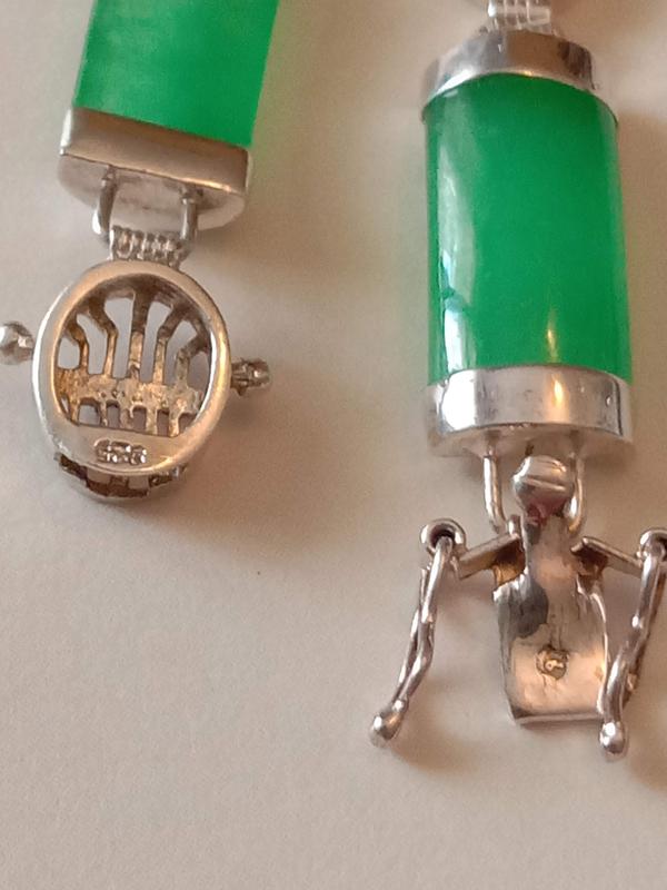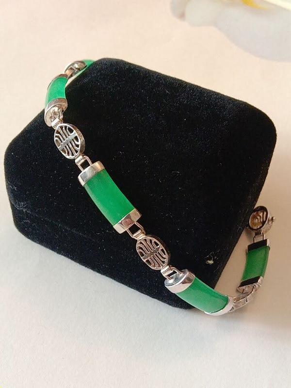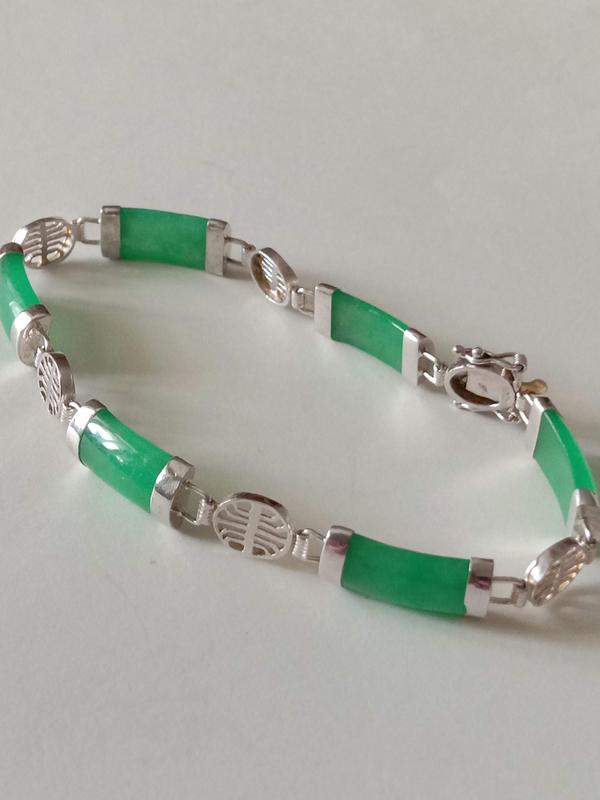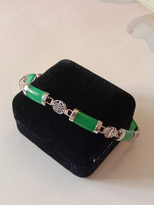 Браслет серебряный нефрит, аккуратный браслет с натуральным зеленым камнем нефрит, длина 15+2 см, серебро 925