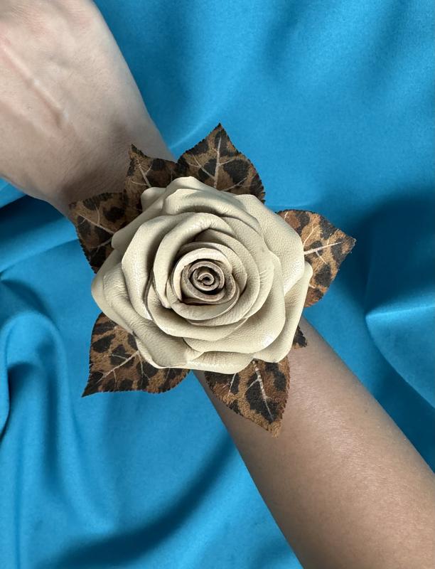 УНИКАЛЬНОСТЬ. Этот эксклюзивный и качественный кожаный браслет выполнен вручную, что делает его единственным в мире! ВЫСОКОКАЧЕСТВЕННАЯ КОЖА. Натуральная кожа - отличного качества и красивых цветов:одна - бежевого цвета, другая - с леопардовым принтом. Комбинация нескольких видов кожи создает интересный дизайн браслета. ФУНКЦИОНАЛЬНОСТЬ: - браслет затягивается на руке; - длина браслета - регулируется; - листья розы - сгибаются. РАЗМЕРЫ РОЗЫ: 7 см. Этот кожаный браслет станет отличным подарком для девушки или женщины на любой случай!