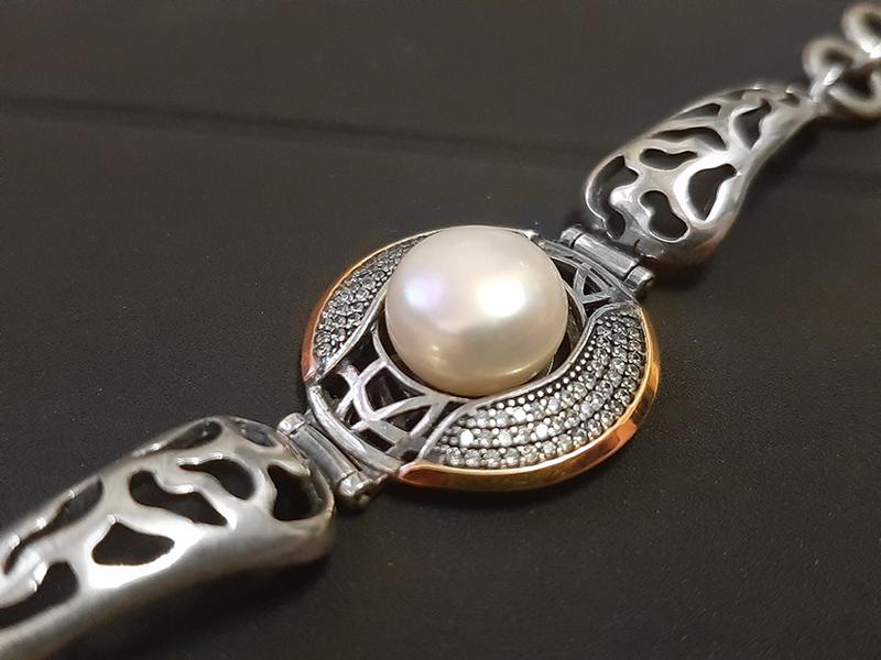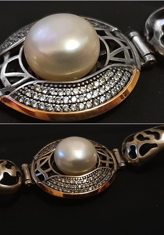 Розсип кубічних цирконів підкреслюють коштовний вигляд центрального елементу браслета.