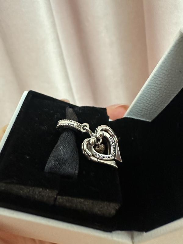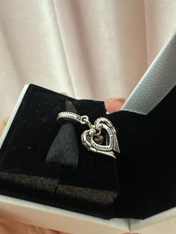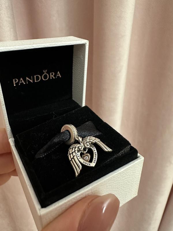 Серебряная бусина пандора, с подвижными частицами (крылья), подписью “Let your dreams fly” и камушком в золотом украшении по центру. Оригинальный, отполированный, используемый.
