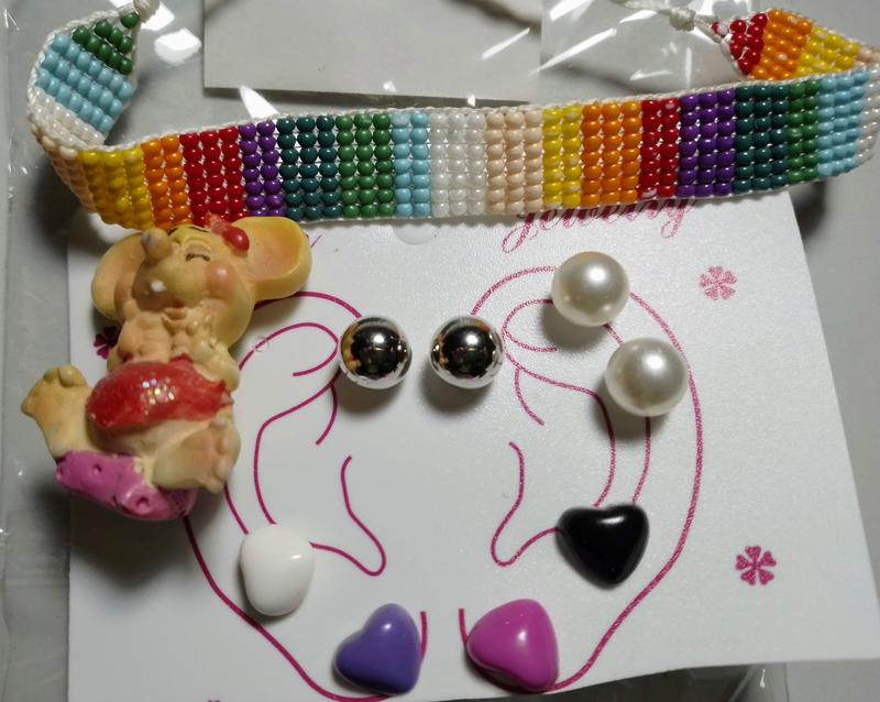 набор бижутерии из авроры. браслет разноцветный бисер фенечка девочке, завязываетс яна руку, к нему тдаю набор серьги гвоздики 3 пары и статуэтка мышка мини в дар. пересилка уп, нп, рз. вопросы по товару пишите в чат на сайте.