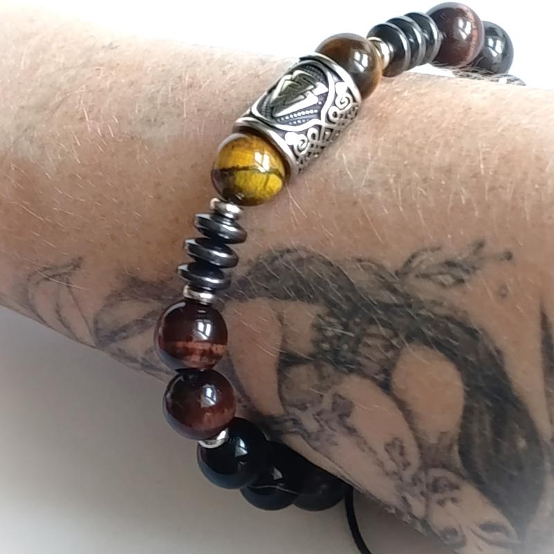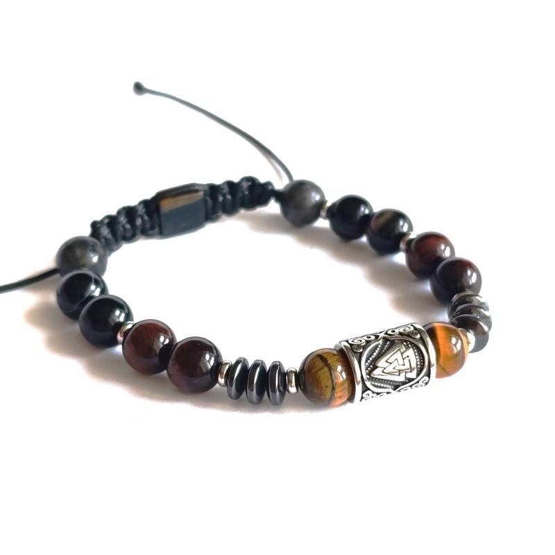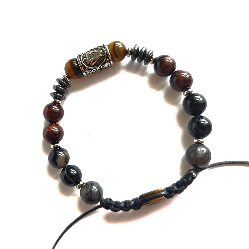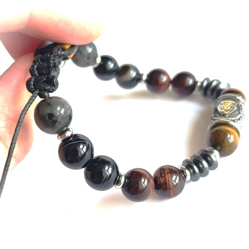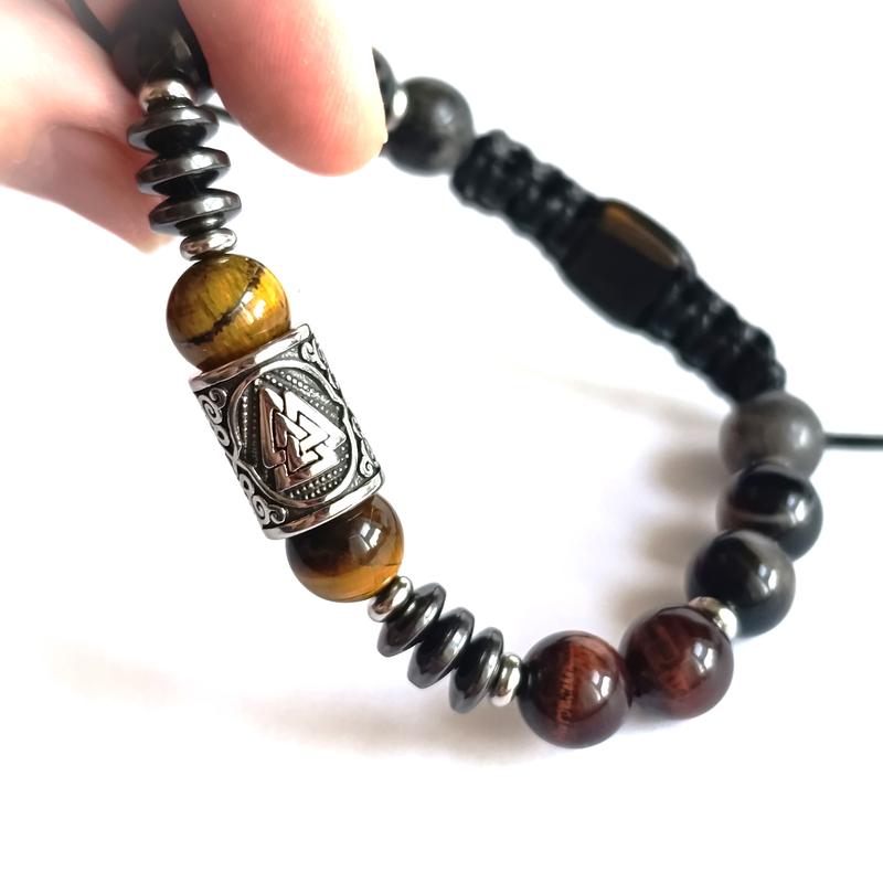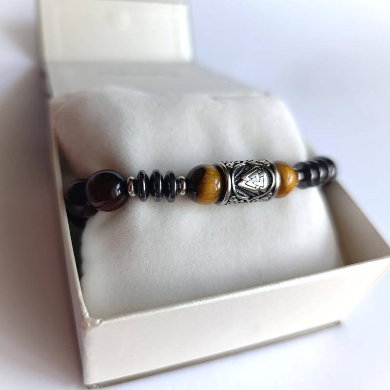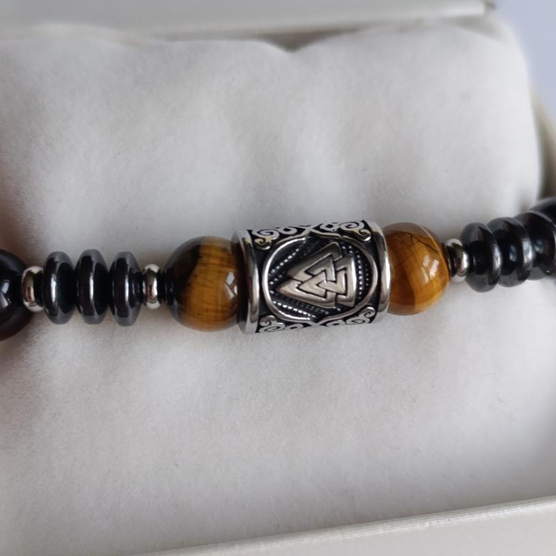 Стильный мужской браслет со скандинавской вставкой Валькнут (есть и Трикверт) с натуральными камнями: черный агат (10 мм), тигровый глаз (10 мм), бычий глаз (10 мм), лабрадор (10 мм) и гематитом (10 мм) из нержавеющей стали и гематита.