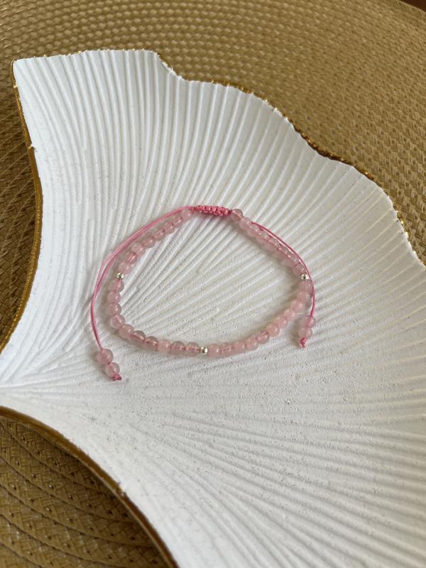 Браслет звенящий из натурального розового кварца 5-8 мм с подвеской.