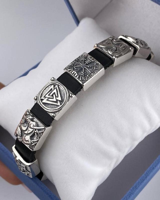 Браслет мужской серебряный с кожаным ремешком как у залужного