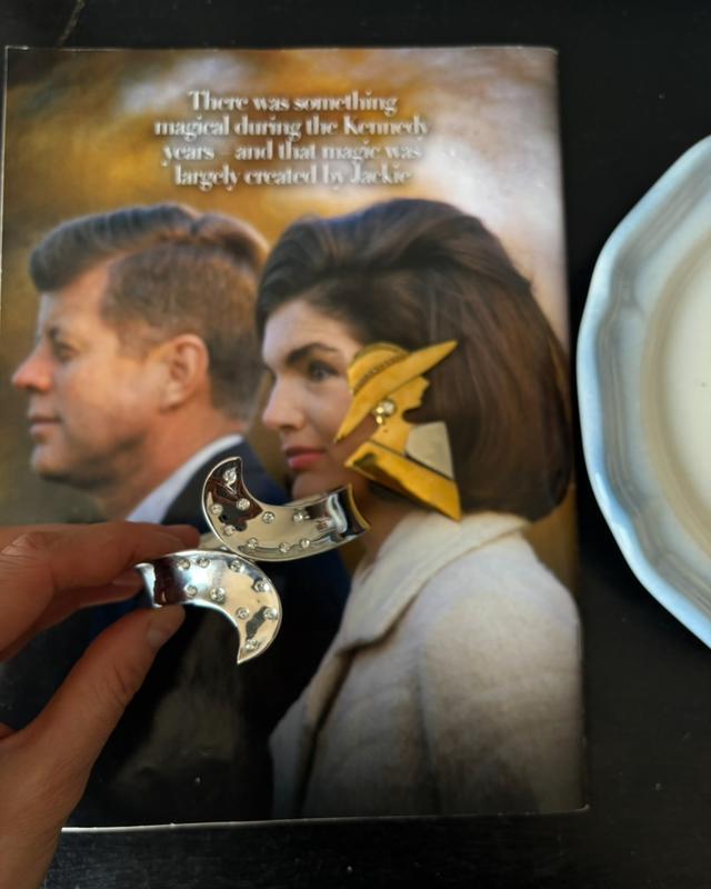 Браслет Butler — дизайнерська річ з характером: вигнута форма, сяйво металу та інкрустація каменями, чудово сидить на руці. Маркування підтверджує автентичність. Ціна — 1200 грн. Брошка — стилізована геометрія в золоті, оригінальна й виразна. Ідеальний акцент на пальто, піджак або капелюшок. 850 грн.
