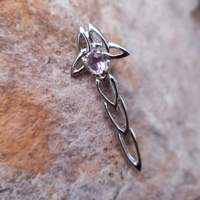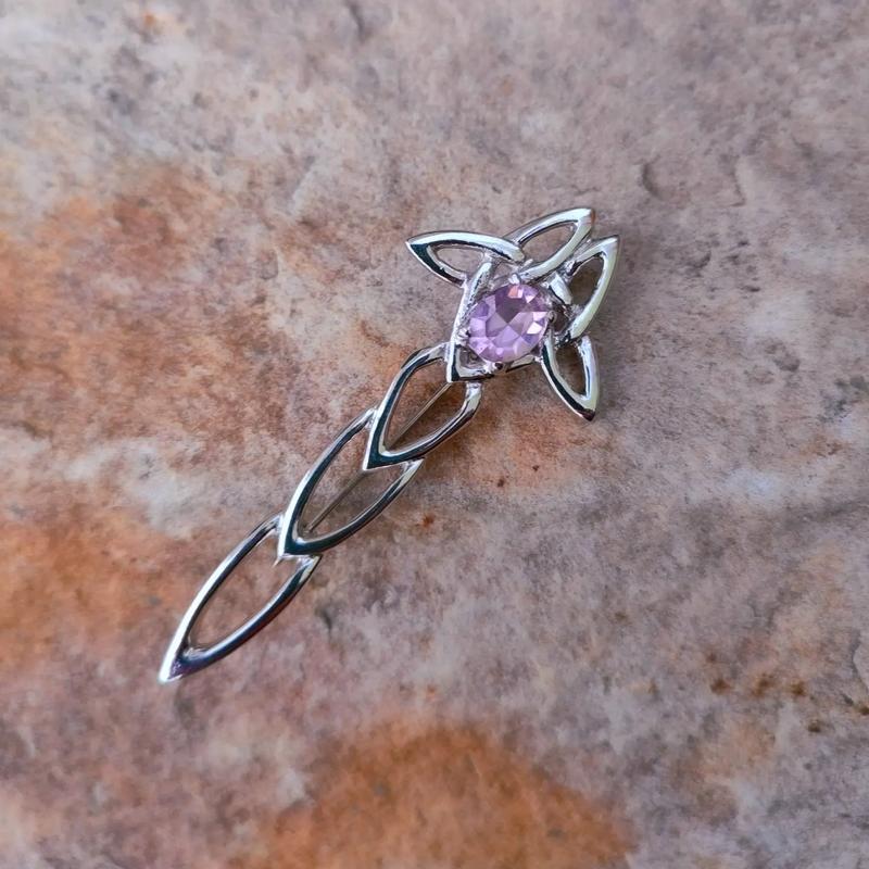 Украшение выполнено из ювелирного сплава серебристого цвета, украшена аметистовым стеклом ( прозрачное, целое). Отличное винтажное состояние.Размер: 7,5 см.